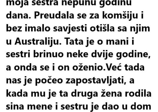 Mama je napustila tatu kada sam ja imala samo 4 godine, a moja sestra nepunu godinu dana. Preudala se za komšiju i bez imalo savjesti otišla sa njim u Australiju. Tata je o mani i sestri brinuo neke dvije godine, a onda se i on oženio.Već tada nas je počeo zapostavljati, a kada mu je ta druga žena rodila sina mene i sestru je dao u dom za nezbrinutu djecu. I on nas je odbacio kao dvije vrećice smeća. 5 godina života u domu bilo je kao u paklu, grozno, čak sam pomišljala da sebi oduzmem život, čemu sve. Mislila sam da gore ne može, a onda je moja mlađa sestra otišla.