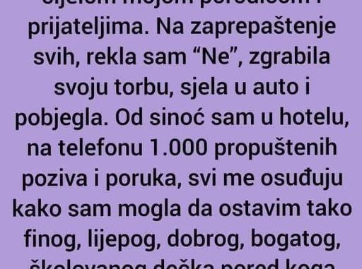 Od sinoć sam u hotelu, na telefonu 1.000 propuštenih poziva i poruka, svi me osuđuju kako sam mogla da ostavim tako finog, lijepog, dobrog, bogatog, školovanog dečka pored koga bih živjela k’o kraljica.